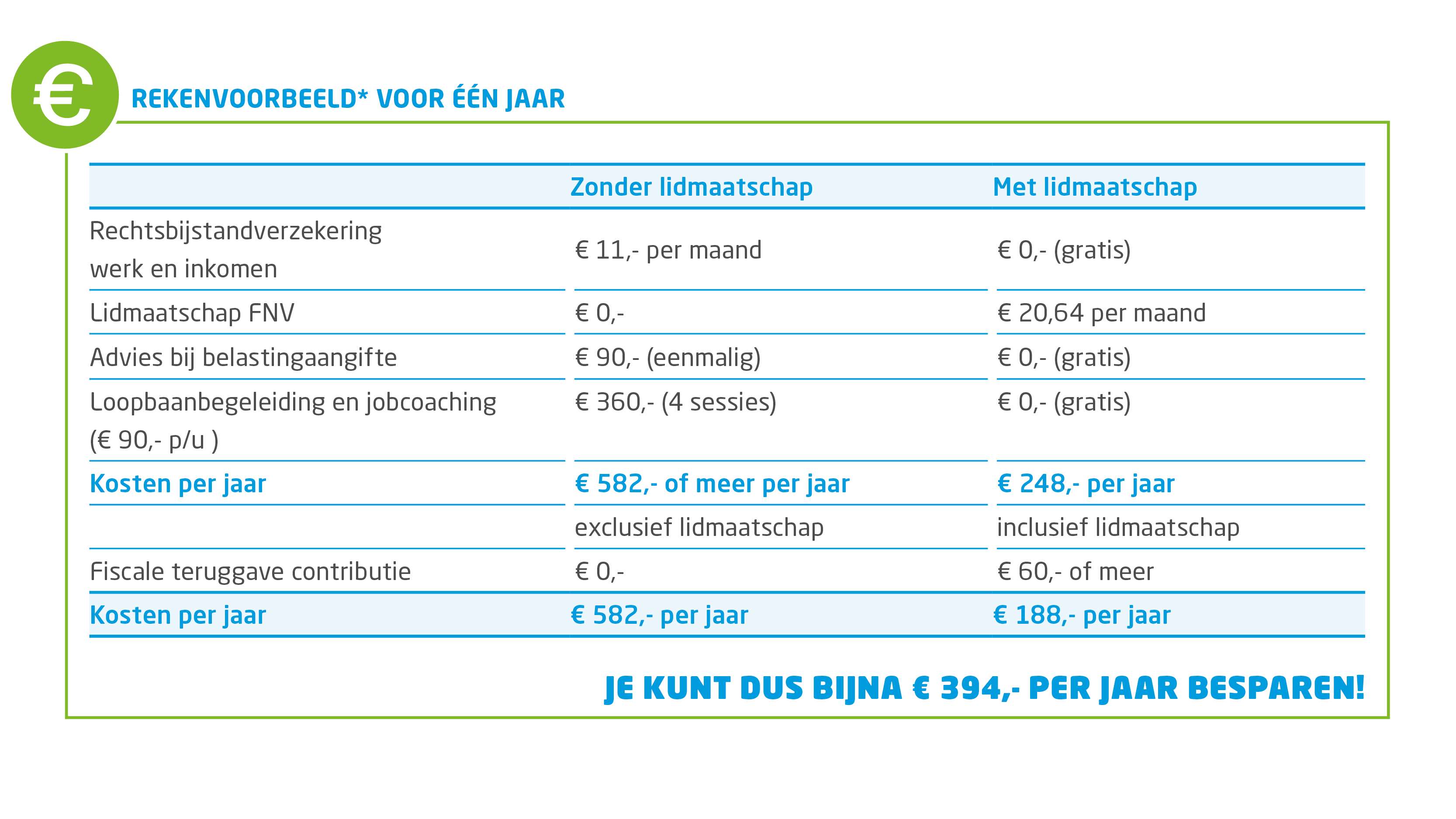 *Disclaimer: Tarieven 2025. Dit is een voorbeeld. Hieraan kunnen geen rechten worden ontleend. In de algemene voorwaarden lees je in welke situaties je gebruik kunt maken van rechtsbijstand van de FNV. Lees de voorwaarden op fnv.nl. Alle bedragen inclusief besparing per jaar en fiscale teruggave, zijn afhankelijk van je persoonlijke situatie en inkomen en gebaseerd op betaling via automatische incasso. Voor betaling per betaalverzoek geldt een toeslag van € 1 per maand.