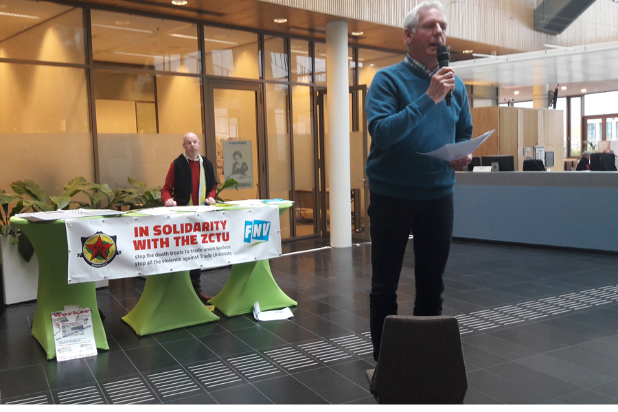 De FNV-werkgroep Sub-Sahara Afrika organiseert vandaag tijdens de lunchpauze een solidariteitsactie op het hoofdkantoor van de FNV in Utrecht. Er is een informatiestand, Bert Giskes en Dick de Graaf zullen er de FNV-medewerkers toespreken over de situatie in Zimbabwe en foto's maken om te sturen aan de collega's in Zimbabwe. De werkgroep heeft een speciale band met voorzitter Peter Mutasa van de ZCTU, Mutasa was vorig jaar nog op bezoek bij de FNV. Ze zullen onder meer wijzen op de slechte economische situatie van Zimbabwe: massale werkeloosheid, een inflatie van 800% per jaar en lonen die nauwelijks toereikend zijn om brood te kopen.